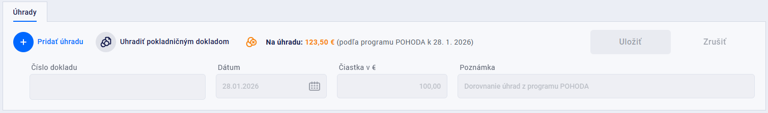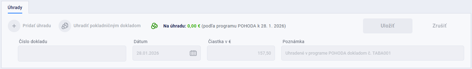 Povelom Pridať úhradu sa na záložke Úhrady vytvorí nový záznam úhrady. Pred jeho uložením môžete upraviť dátum vykonania úhrady a čiastku úhrady.