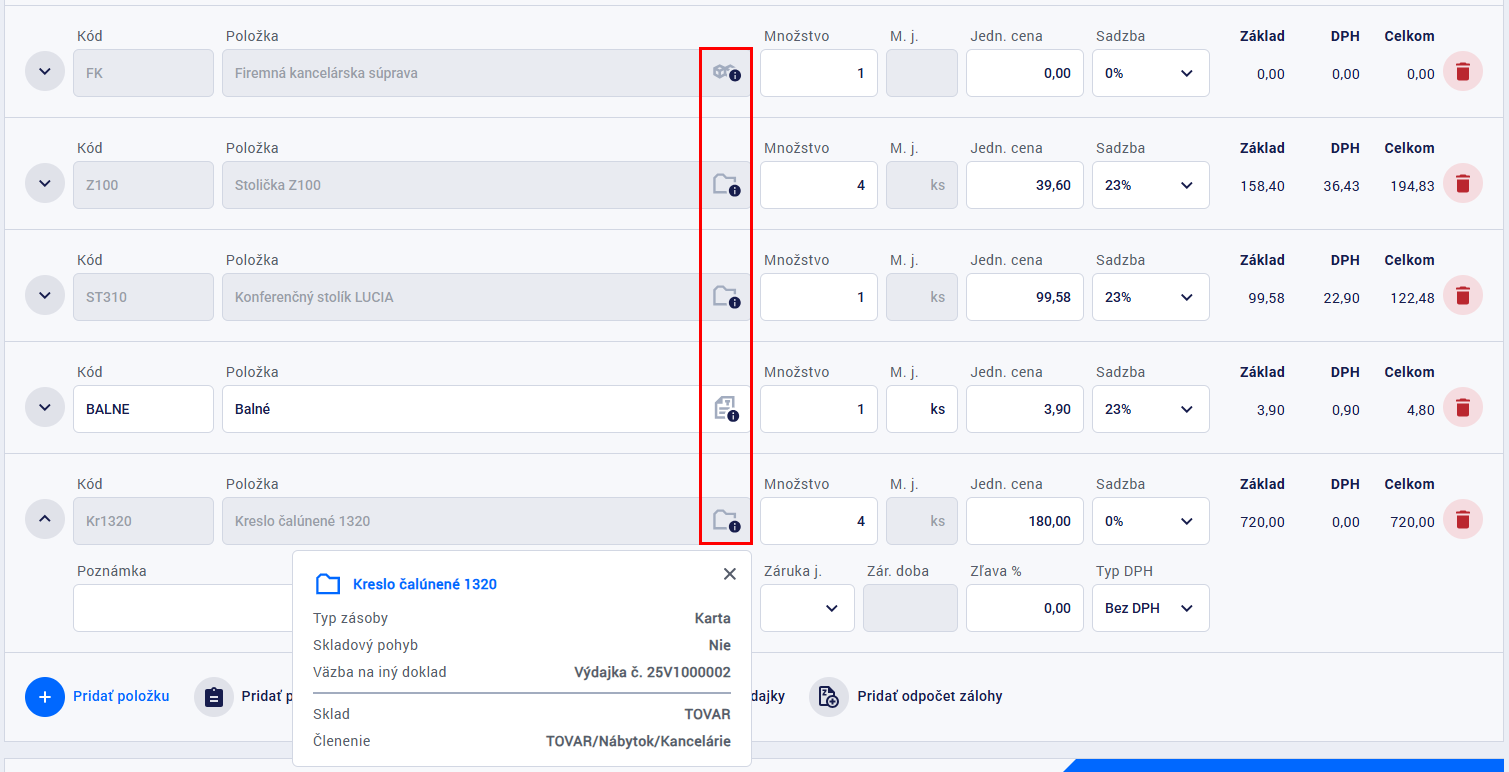 Kliknutím na ikonu sa zobrazí informačný box, v ktorom sú uvedené doplňujúce údaje vzťahujúce sa k danej položke - v prípade položky s väzbou na cenník je tu uvedené, či položka na danom doklade spôsobuje skladový pohyb a z akého skladu je. Pokiaľ bola položka prenesená z iného dokladu, zobrazuje sa aj informácia o zdrojovom doklade.