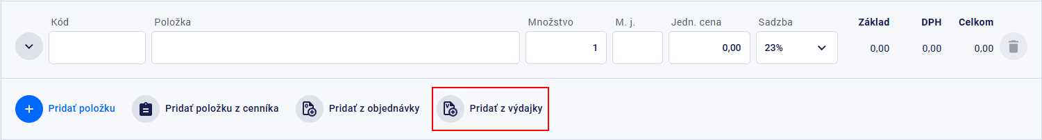 Položku je možné na doklad zadať priamym zápisom alebo výberom položky z cenníka. Priamo z dokladu je tiež možné do cenníka pridať novú položku. Detailné informácie k práci s položkou na doklade sú uvedené na stránke Položky dokladu.