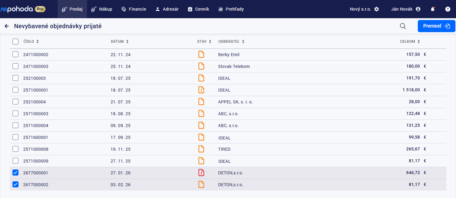 Na prenos je možné vybrať aj viac objednávok súčasne.