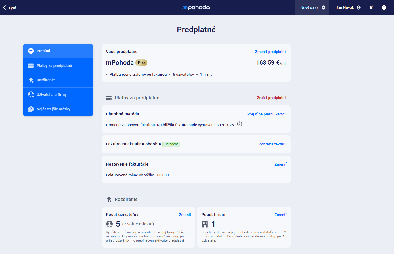 V sekcii Vaše predplatné sa zobrazujú základné informácie o aktuálne platnom predplatnom, vrátane počtu používateľov a počtu firiem, ktoré môžete v rámci predplatného využívať.