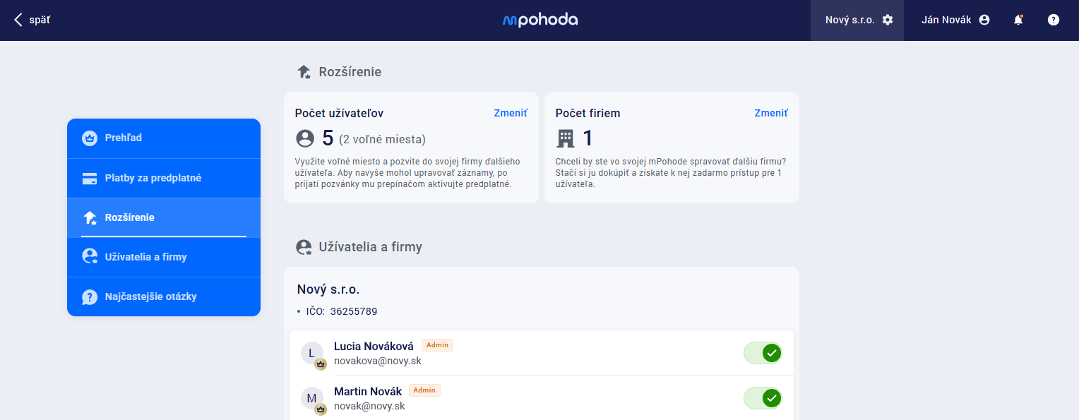 Užívateľ, ktorému bolo pridelené Predplatné, získava užívateľské predplatné vo všetkých firmách založených v aplikácii mPohoda, do ktorých má tento užívateľ prístup.